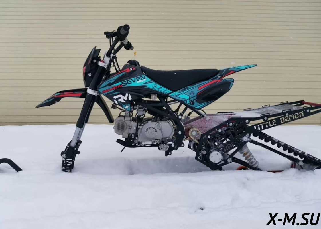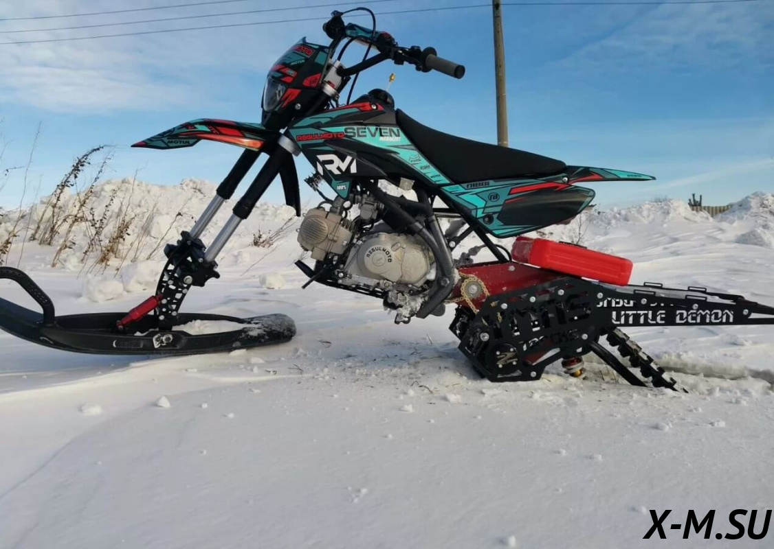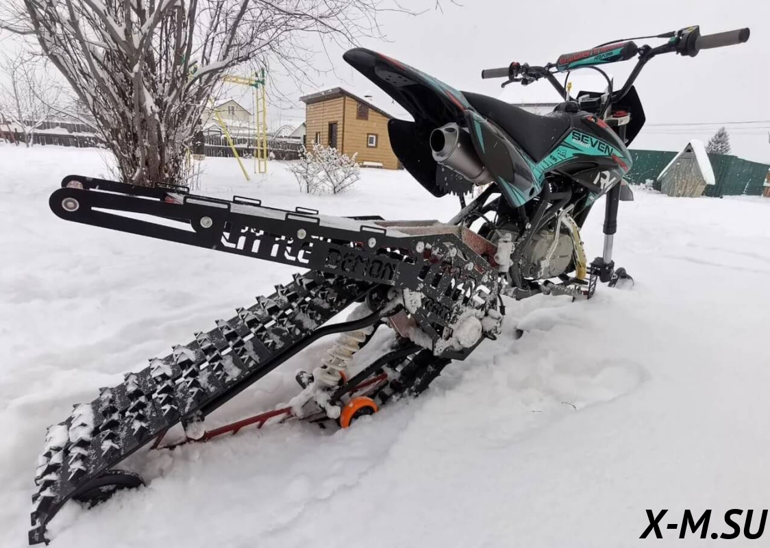 Little demon от YmasTracks — универсальный гусеничный комплект для внедорожных мотоциклов. Гусеничный мотоцикл (СНОУБАЙК) это, по сути, одноколейный снегоход. Вы получаете возможность продлить мото сезон и эксплуатировать мотоцикл не только летом но и зимой.